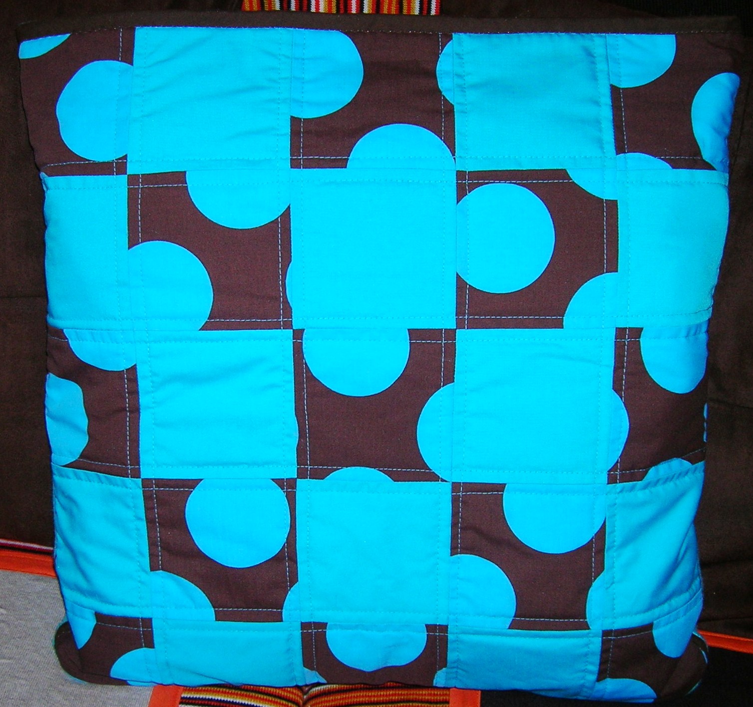 Para la funda del cojín he usado una combinación de dos telas, una en azul, y la otra en chocolate con círculos azules.